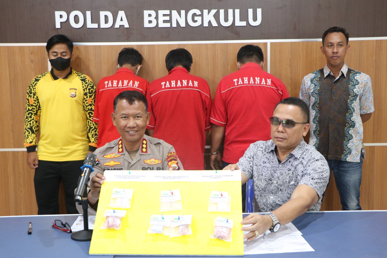 Kabid Humas Polda Bengkulu Kombes Pol Sudarno, S.Sos., M.H., didampingi Kasubdit 3 Kompol M. Simaremare saat press conference yang digelar di aula Ditresnarkoba hari ini (15/07/22) mengungkapkan, pada hari Jum’at tanggal 8 Juli 2022 pihaknya berhasil menangkap tiga orang tersangka pengedar narkoba jenis sabu-sabu.