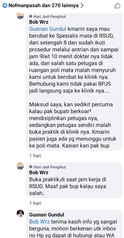 Bob Wrz dalam komentarnya mengatakan” Kemaren saya mau berobat ke spesialis mata di RSUD dari Jam 07:30 Wib dan sudah mengikuti antrian sampai Jam 9:10 Wib. Dokternya tidak ada dan salah satu petugas di ruangan poli mata malah menyuruh kami berobat ke kliniknya, berhubung kami tidak punya BPJS langsung aja kami ke kliniknya, maksud saya kan sedikit percuma kalau pak Bupati berkoar²